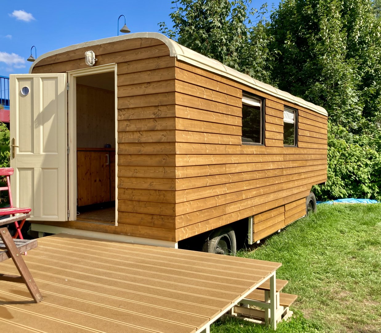 Naše maringotka prošla nedávnou celkovou rekonstrukcí, aby poskytovala maximální pohodlí a komfort. Ideální pro pobyt dvou osob, s postelí o rozměrech 180x200 se snadno vejde i malá rodina. Vybavena je lednicí s mrazákem, rychlovarnou konvicí a základním nádobím. Je zde elektřina i voda.