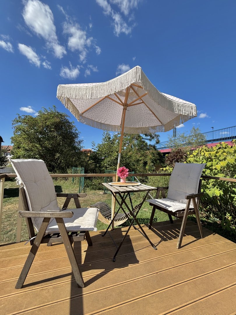 Vybavení pro 4 osoby, v přízemí 1 postel a v 1. patře manželské dvojlůžko. Krásný výhled na zámek.