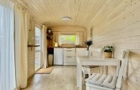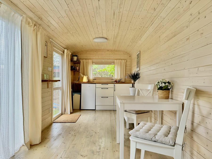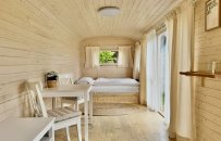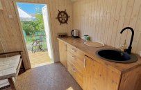 Chata č. 5 je vybavená klidně pro delší pobyt, má vlastní kuchyňský kout, koupelnu, toalety, nový nábytek + unikátní design.