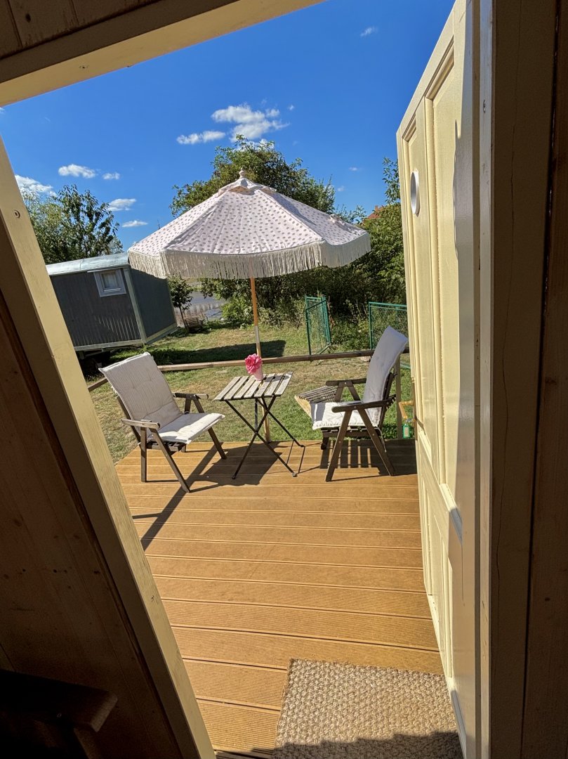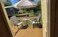 Z maringotky se snadno dostanete k řece Berounce a jejímu malebnému brodu s výhledem na zámek. Užijte si odpočinek na terase se slunečníkem a s nádherným výhledem na okolní krajinu a zámek. Na druhé straně kempu je restaurace a bistro s pláží kde si můžete vychutnat rozličné občerstvení, zmrzlinu, vykoupat se v řece nebo si půjčit kanoi a paddleboard.